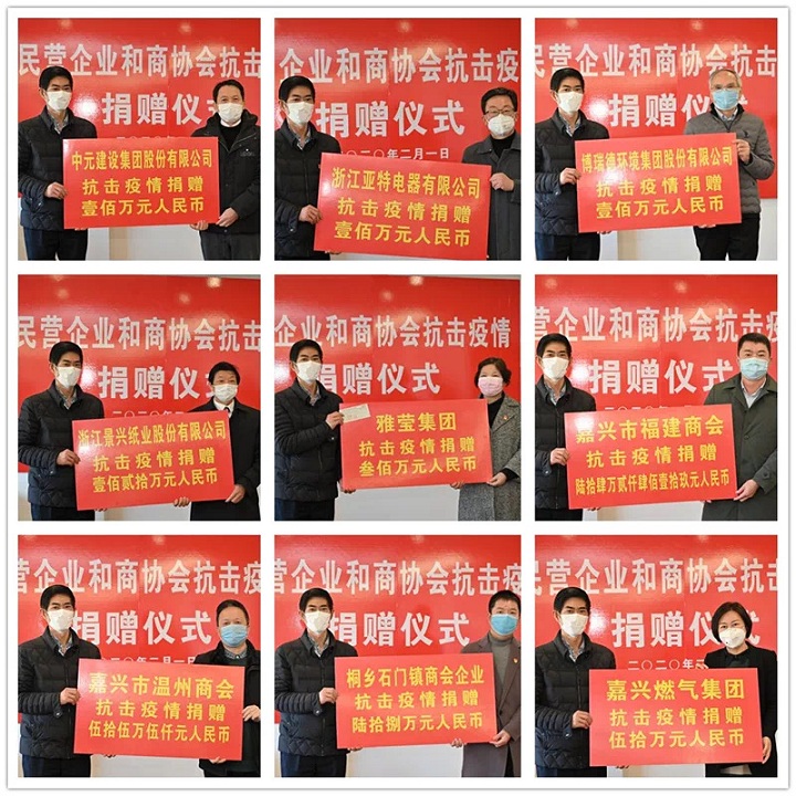 1月29日,中共嘉兴市委统战部、嘉兴市工商联向广大民营企业和工商联所属商协会发出“八方驰援,同舟共济”号召后,雅莹集团、景兴纸业、亚特电器、中元建设、博瑞德环境,市福建商会、温州商会、台州商会、河南商会、食品工业协会等民营企业和商协会积极响应,35家商协会和民营企业参加2月1日市委统战部和工商联组织的向嘉兴市红十字会捐款捐物活动,推动形成民营企业积极履行社会责任。