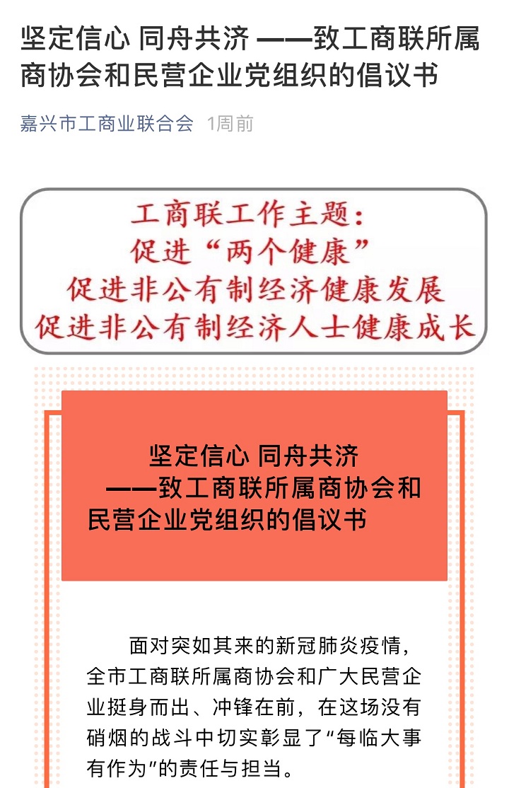 2月12日,嘉兴市工商联向所属商协会党组织发出倡议书,号召大家坚定信心,同舟共济。全市工商联所属商协会党组织不忘初心、牢记使命,挺身而出、扎实工作,充分发挥党组织战斗堡垒和党员先锋模范作用,团结带领广大会员众志成城、共御疫情,坚决打赢疫情防控阻击战。