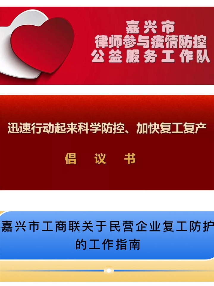 市工商联第一时间发布《迅速行动起来科学防控、加快复工复产倡议书》、《同心同行共克时艰 群策群力齐促和谐—致全市广大企业和职工的倡议书》、《关于做好专业科学的节后复工准备的倡议》、《嘉兴市工商联关于民营企业复工防护的工作指南》,及时向民营企业推送浙江省企业复工和疫情防控17条规定、浙江省支持微小企业渡过难关21条、嘉兴市应对疫情支持企业稳定健康发展“21条”、嘉兴市抗击新冠肺炎帮扶企业共渡难关现行税收优惠政策汇总、嘉兴市工业企业发生新冠肺炎病例应急处置参考指南、嘉兴企业市外员工返工返岗指南等政策,指导广大民营企业制定科学合理的复工复产计划,分期、分批加快安排复工复产,并引导有条件的企业增加排班频次、优化排班人员,努力提升复工复产比例。