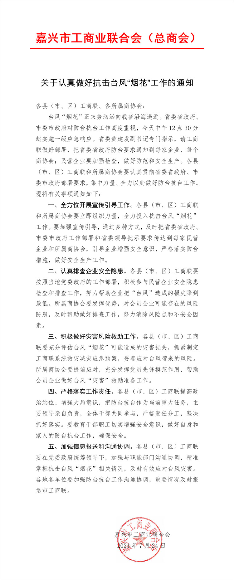关于认真做好抗击台风“烟花”工作的通知