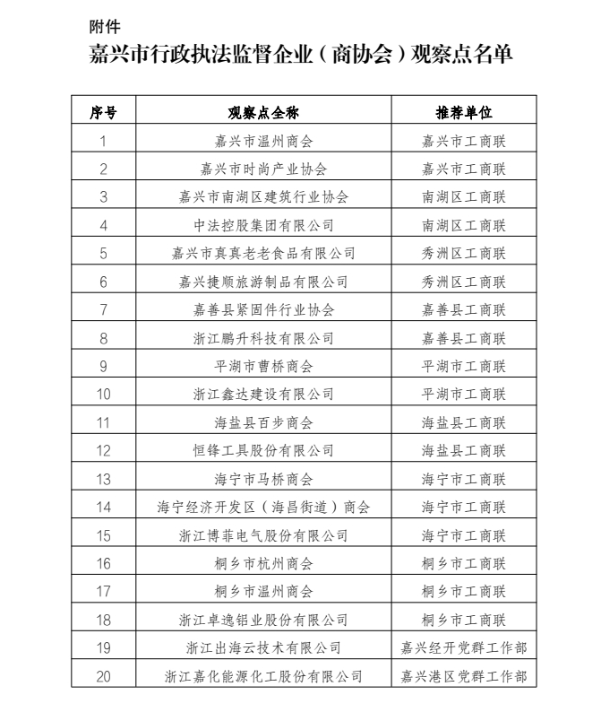 附件:嘉兴市行政执法监督企业(商协会)观察点名单