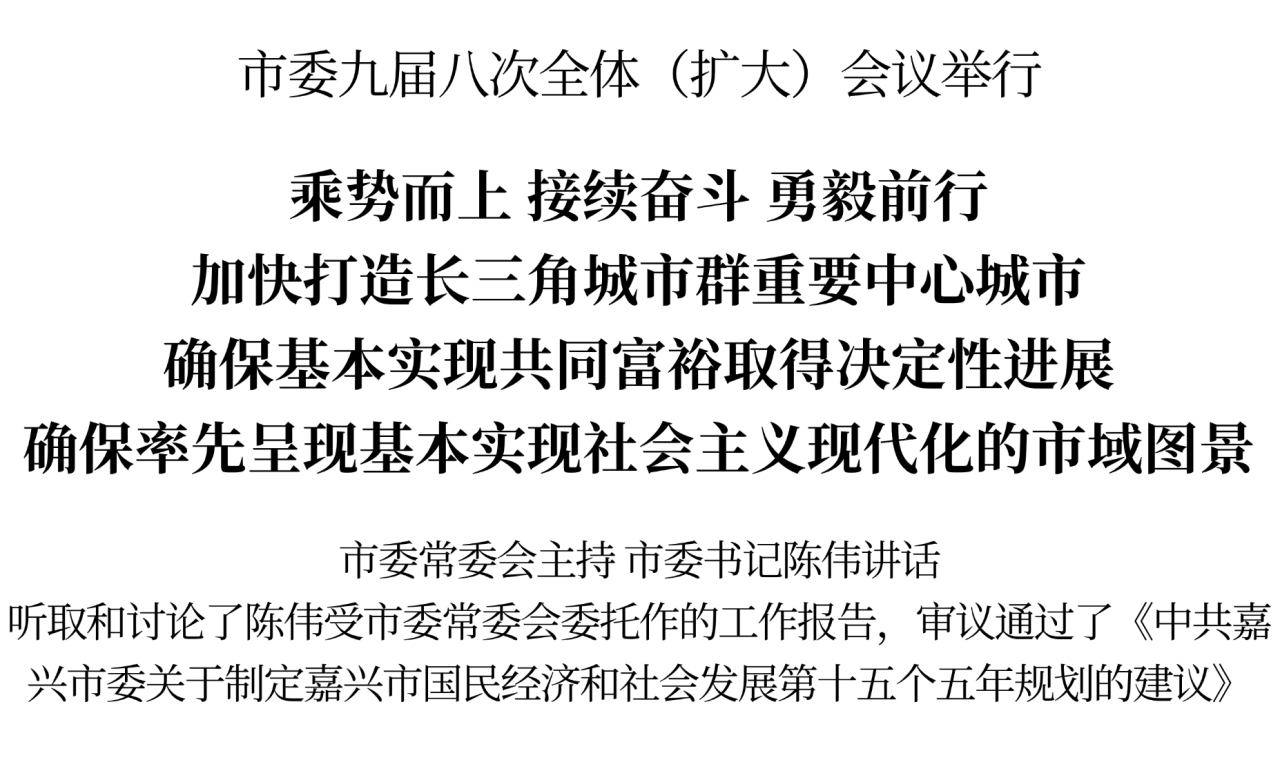 全会认为,党的二十届四中全会是在“十四五”即将圆满收官、“十五五”新征程即将开启的关键节点召开的一次重要会议。习近平总书记在全会上的重要讲话和全会通过的《建议》,对乘势而上、接续推进中国式现代化建设进行了总动员、总部署,为未来五年经济社会发展提供了根本遵循和行动指南。省委十五届八次全会对全省“十五五”时期经济社会发展作出总体规划和系统部署,为我们科学谋定嘉兴“十五五”发展蓝图指明了方向、明确了路径。